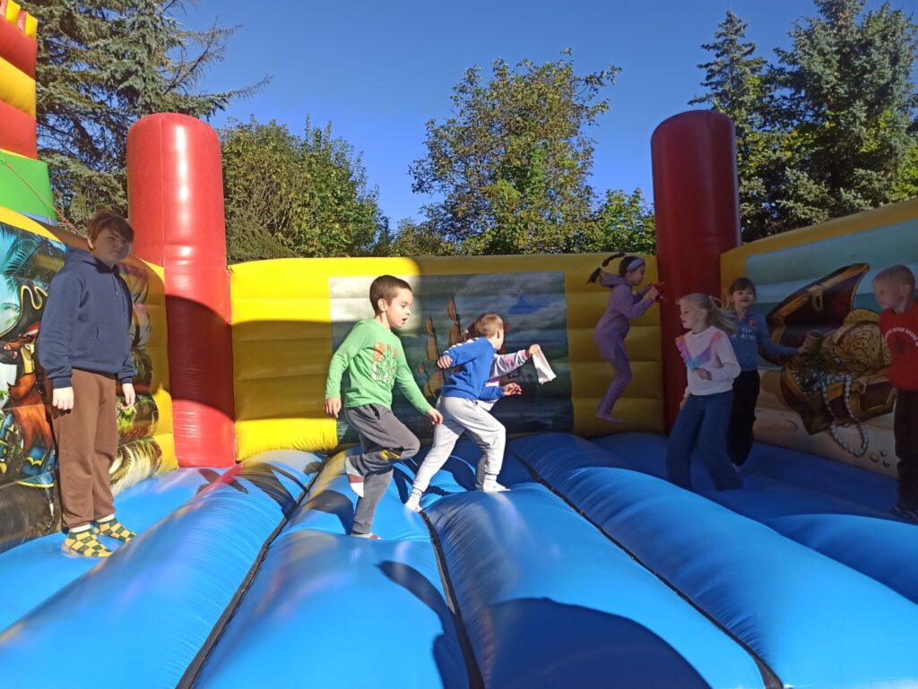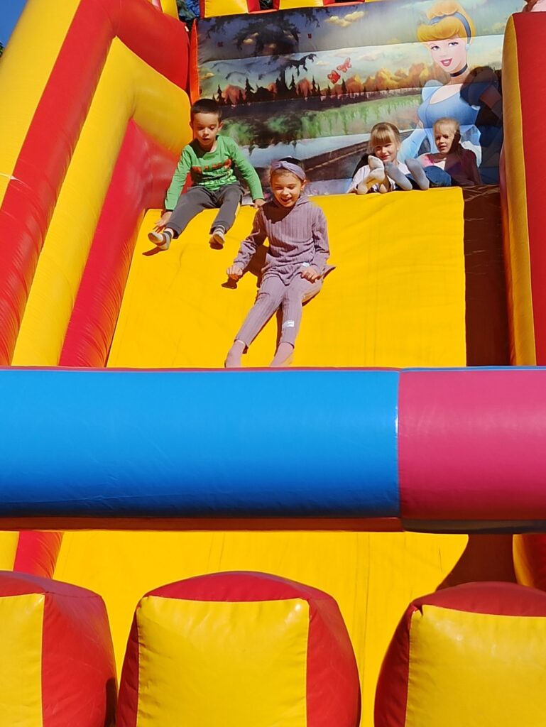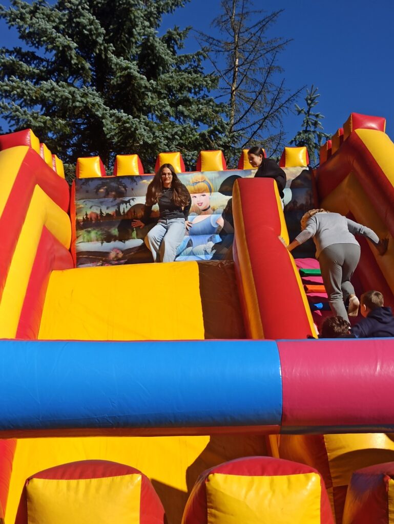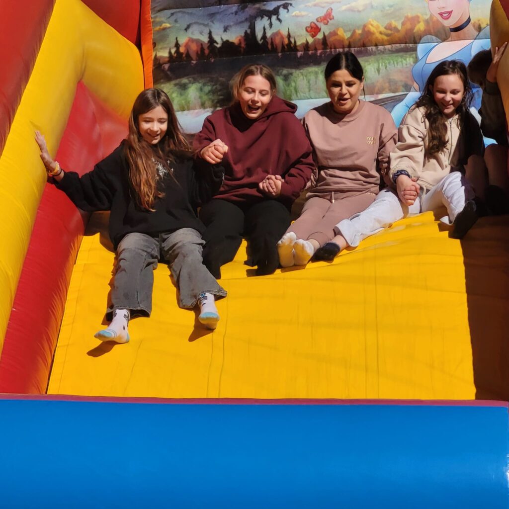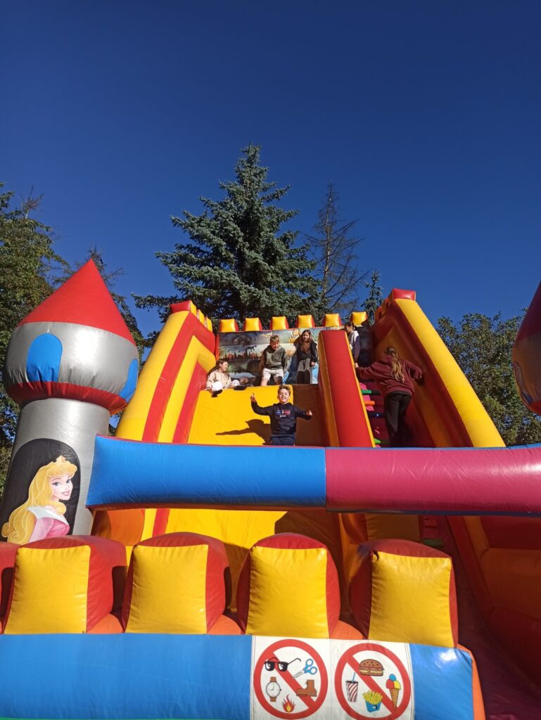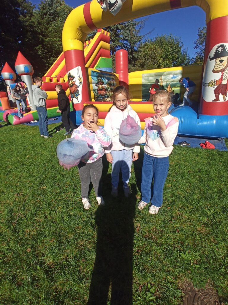 На щастя погода була чудовою, тож ми не лише каталися і скакали на надувних атракціонах, а й скуштували печені на вогнищі ковбаски, поласували різними солодощами. Атмосфера була веселою й дружньою.